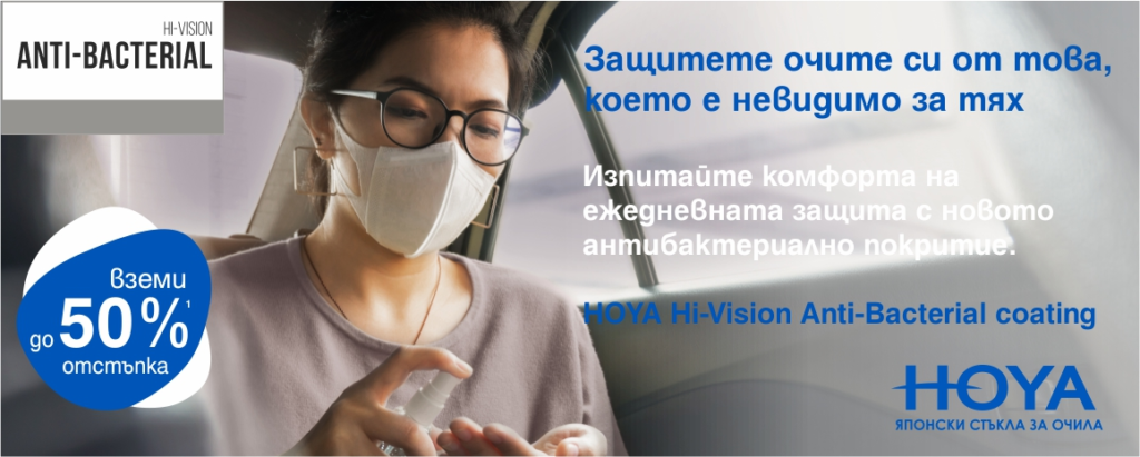 Възползвайте се сега от допълнителна антибактериална защита в комбинация с най-устойчивите премиум покрития от HOYA – Hi-Vision UV Control и Hi-Vision BlueControl.