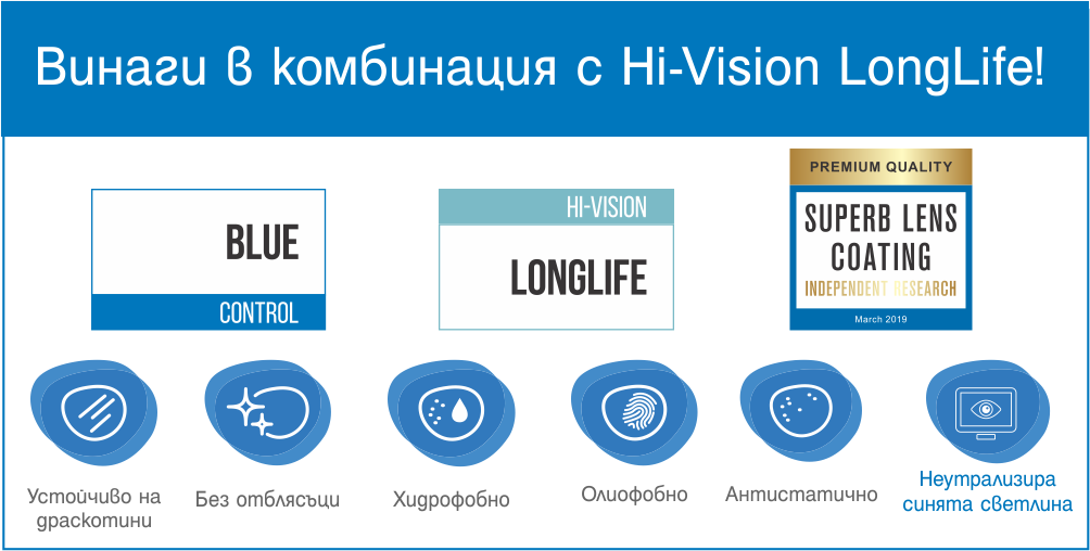 Това поддържа очите в по-добро състояние като предоставя по-комфортно и спокойно зрение, както и естествено възпреимане на цветовете.BlueControl се предлага в комбинация с ненадминатото по качества AR покритие Hi-Vision LongLife. Слоевете на това покритие са с до 7 пъти по-устойчиви на драскотини в сравнение със стандартните.